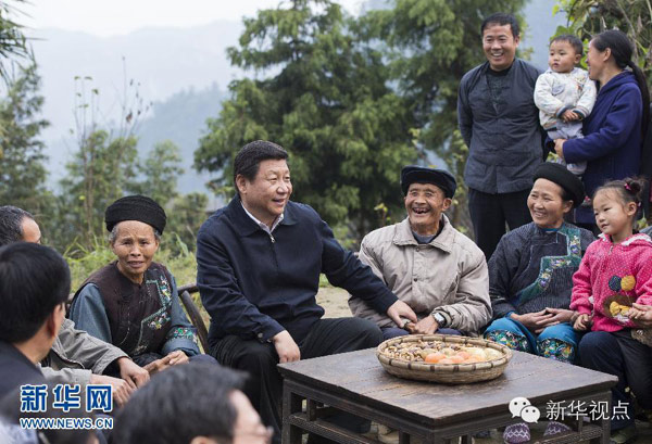習近平在湘西土家族苗族自治州花垣縣排碧鄉十八洞村同村干部和村民座談。新華社記者 王曄 攝