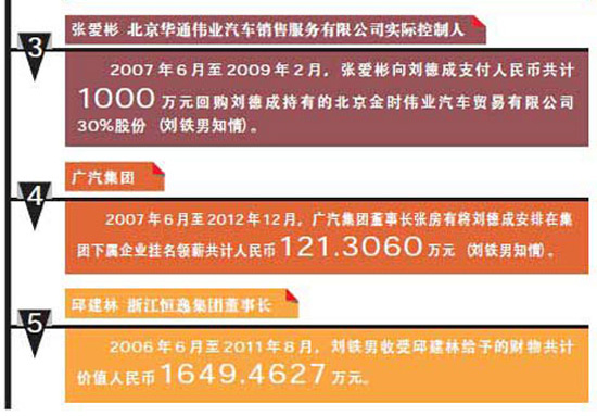 2002年至2012年間,劉鐵男利用職務(wù)便利,為他人在項(xiàng)目審批、設(shè)立汽車4S店等方面謀取利益,單獨(dú)或與其子劉德成共同非法收受財(cái)物共計(jì)價(jià)值人民幣3558萬(wàn)余元。