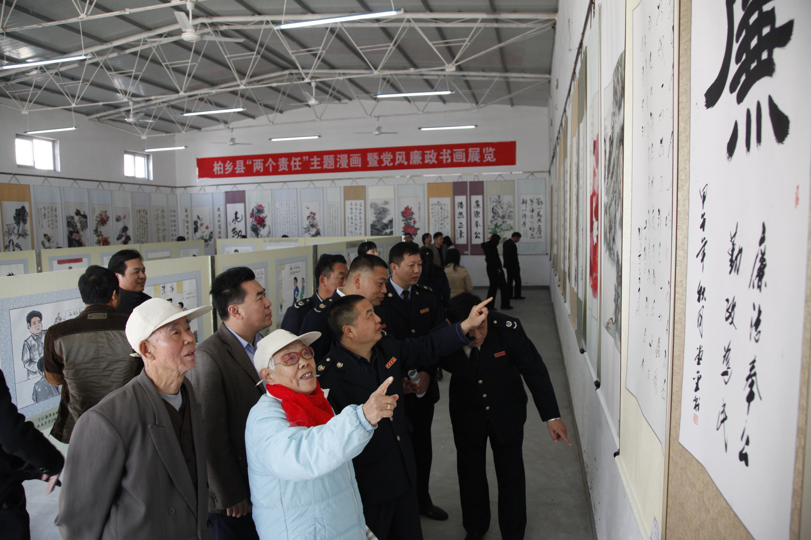 干部群眾駐足欣賞漫畫及廉政書法作品