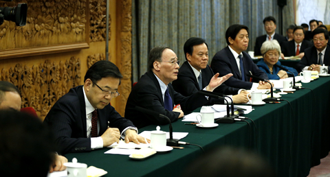 3月11日,中共中央政治局常委、中央紀委書記王岐山參加十二屆全國人大四次會議貴州代表團的審議。(新華社記者鞠鵬 攝)