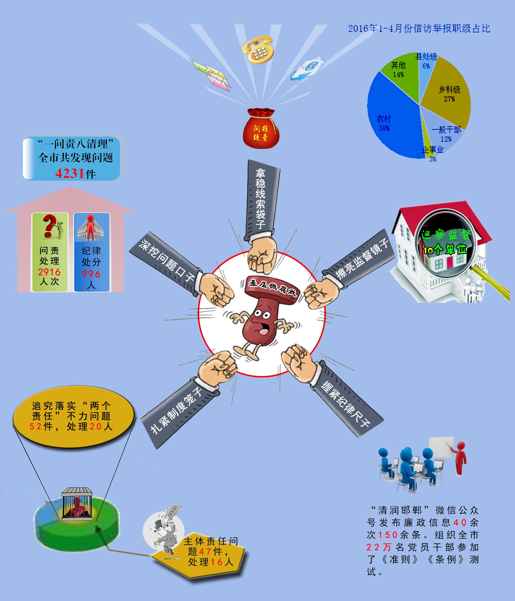 【工作體會】邯鄲市委常委、市紀委書記魏吉平:從近兩年特別是今年的信訪數據來看,反映鄉科級及以下等基層干部問題占信訪總量的77%。基層“微腐敗”損害的是老百姓切身利益,啃食的是群眾獲得感,揮霍的是基層群眾對黨的信任,必須“下猛藥”治理。今年以來,邯鄲市以治理基層微腐敗為切入點,深挖細查,嚴格執紀監督問責,推進全面從嚴治黨向基層延伸,讓微權力運行不再任性。