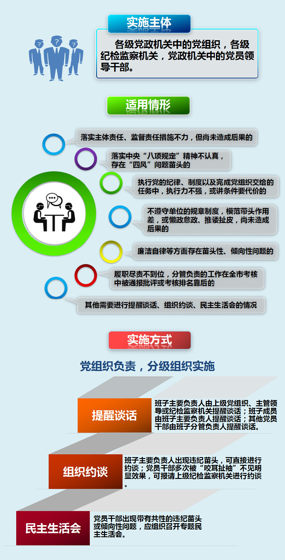 ????咬耳扯袖,打上一針清醒劑。市、縣黨委政府成立落實主體責任辦公室(簡稱主體辦),針對黨員干部出現7類問題,特別是過于籠統、不具備可查性的,按照黨組織負責、分級組織實施的原則,啟動提醒談話程序,班子主要負責人由上級黨組織、主管領導或紀檢監察機關負責提醒談話;班子成員由班子主要負責人負責提醒談話;其他黨員干部由班子分管負責人負責提醒談話。多次被“咬耳扯袖”后,效果仍不明顯的黨員干部,由上級紀檢監察機關予以組織約談。提醒、約談一對一,所有資料歸檔留存,主體辦適時開展抽查復核,保證提醒入腦入心,約談警鐘長鳴。截至目前,已“提醒”18人次,提出意見建議35條。