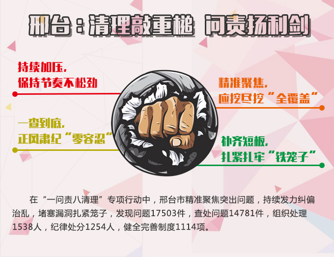 在“一問責八清理”專項行動中,邢臺市精準聚焦突出問題,持續(xù)發(fā)力糾偏治亂, 堵塞漏洞扎緊籠子,發(fā)現問題17503件,查處問題14781件,組織處理1538人,紀律處分1254人,健全完善制度1114項……