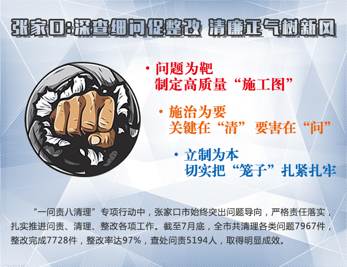“一問責(zé)八清理”專項(xiàng)行動(dòng)中,張家口市始終突出問題導(dǎo)向,嚴(yán)格責(zé)任落實(shí),扎實(shí)推進(jìn)問責(zé)、清理、整改各項(xiàng)工作。截至7月底,全市共清理各類問題7967件,整改完成7728件,整改率達(dá)97%,查處問責(zé)5194人,取得明顯成效。