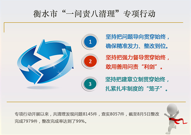 今年以來,按照省委部署要求,衡水市委、市紀(jì)委將“一問責(zé)八清理”專項(xiàng)行動作為蕩除沉痼、觸及靈魂的精神再洗禮,作為踏石留印、抓鐵有痕的作風(fēng)再錘煉,作為發(fā)現(xiàn)問題、解決問題、優(yōu)化環(huán)境的大機(jī)遇,始終堅(jiān)持高規(guī)格部署、高頻率調(diào)度、高效率推進(jìn),打響了一場打通梗阻、清除積弊的攻堅(jiān)戰(zhàn)。