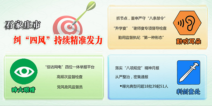 為遏制“四風”問題反彈回潮,石家莊市在健全完善定期督查、隨機抽查等制度的基礎上,堅持把“四風”問題作為紀律審查的重點,建立并實施落實“八項規定”精神月報制度,各級各部門逐月上報查糾違反“八項規定”精神的問題和典型案例,形成了正風肅紀持續有力的震懾。