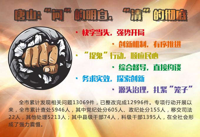“捉鬼”行動,順應民心。根據唐山市實際,從4月19日開始開展重心下移“捉小鬼”專項行動,著力整治損害群眾和市場主體利益的不正之風和腐敗行為。整個行動圍繞全市各級行使“六項權力”和具有公共服務職能的鄉科級及以下黨員、公職人員、農村兩委班子成員,重點聚焦“首次受理不登記,掩蓋超時辦理”“不給好處不辦事、給了好處亂辦事”等10類違規違紀行為,通過宣傳營造氛圍、強化線索收集、加大紀律審查力度、公開晾曬曝光等方式強力推進,各類“小鬼”無處遁形。截至目前,共查處各類案件798件,處理科級干部152人、科級以下干部646人;公開通報三批、13件典型案件,使人民群眾深切感受到我們在行動,“一問責八清理”專項行動氛圍進一步濃厚。