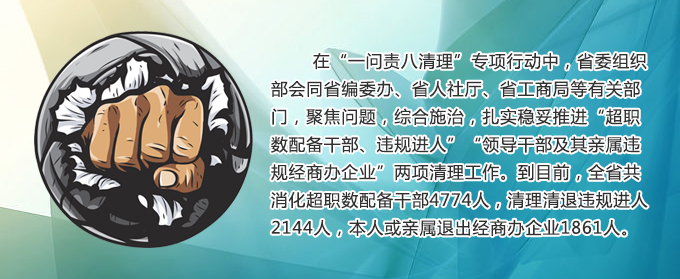 在“一問責(zé)八清理”專項行動中,省委組織部會同省編委辦、省人社廳、省工商局等有關(guān)部門,聚焦問題,綜合施治,扎實穩(wěn)妥推進(jìn)“超職數(shù)配備干部、違規(guī)進(jìn)人”“領(lǐng)導(dǎo)干部及其親屬違規(guī)經(jīng)商辦企業(yè)”兩項清理工作。到目前,全省共消化超職數(shù)配備干部4774人,清理清退違規(guī)進(jìn)人2144人,本人或親屬退出經(jīng)商辦企業(yè)1861人。