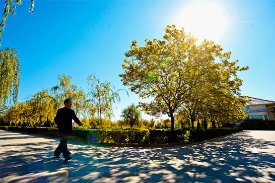 清晨,帶著絲絲的清涼,伴著和煦的陽光,漫步在寬敞整潔的街道上,身心都愉悅了。
