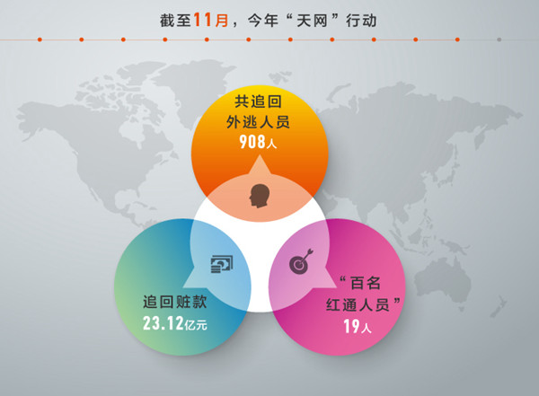 ????尚有一人在逃,追逃追贓就決不停止。隨著紅色通緝令通緝的頭號嫌犯楊秀珠的投案自首,“百名紅通人員”已有37人到案。截至11月,今年“天網”行動共從70多個國家和地區追回908人,其中外逃國家工作人員122人,追回贓款23.12億元,“百名紅通人員”19人。