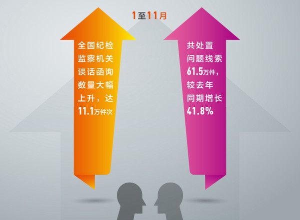????1至11月,全國紀檢監察機關談話函詢數量大幅上升,達11.1萬件次,共處置問題線索61.5萬件,較去年同期增長41.8%,問題線索存量持續下降,增量逐步減少。