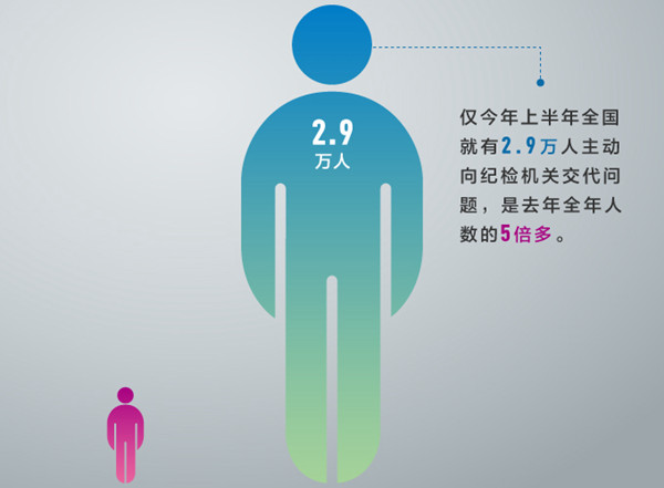 ????寬嚴相濟帶來了廣大黨員干部相信組織、依靠組織的可喜變化。僅今年上半年全國就有2.9萬人主動向紀檢機關交代問題,是去年全年人數的5倍多。