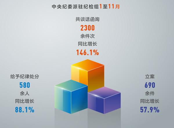 ????按照中央紀委向中央一級黨和國家機關派駐紀檢機構的方案,完成47家派駐紀檢組組建工作,選好干部、配強班子。派駐監督作用不斷突顯,查處違紀問題力度持續加大。中央紀委派駐紀檢組1至11月共談話函詢2300余件次,立案690余件,給予紀律處分580余人,同比分別增長146.1%、57.9%、88.1%。