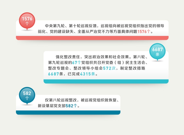 ????針對巡視反饋的問題,強化整改責任,突出政治效果和社會效果。第八輪、第九輪巡視的67個黨組織已召開黨委(組)民主生活會、整改專題會、整改領導小組會572次,制定整改措施6687條,完成4315條。僅第八輪整改,被巡視黨組織就恢復、新設基層黨支部582個。