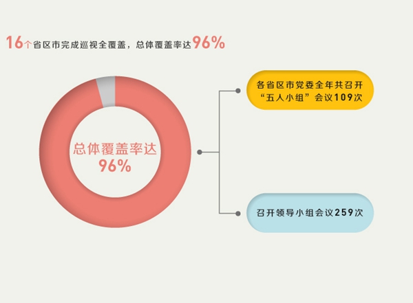 ????在深化中央巡視工作的同時,2016年,省區市和中央單位巡視工作進一步加強,市縣巡察制度不斷推進。截至目前,已有16個省區市完成巡視全覆蓋,總體覆蓋率達96%。各省區市黨委全年共召開“五人小組”會議109次,召開領導小組會議259次,推動巡視工作深化發展。