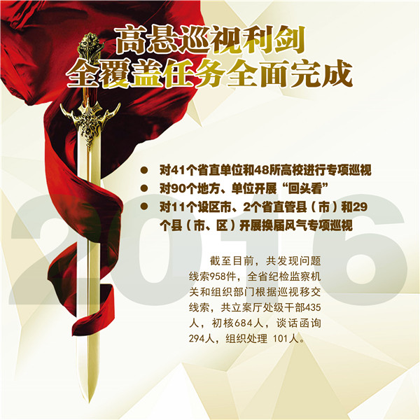 剛剛過去的2016年,省委巡視機構聚焦全面從嚴治黨,深化政治巡視,發現問題、形成震懾,劍指問題、促進改革,圓滿完成巡視全覆蓋任務,著力構建巡視監督新格局,巡視利劍頻亮,巡視成效彰顯。