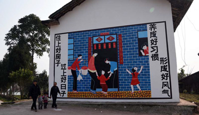 ????四川南充市高坪區東觀鎮大石頭村五組村民正漫步在文化墻旁。東觀鎮在全鎮30面民宅墻頭畫有“新風正氣”“社會主義核心價值觀”等內容,達近千平方米,為鄉村民宅增添了文化氣息。人民視覺