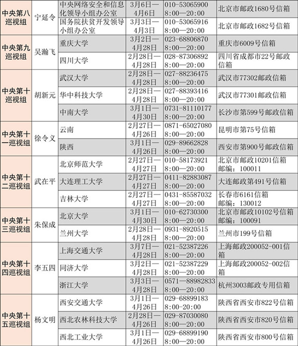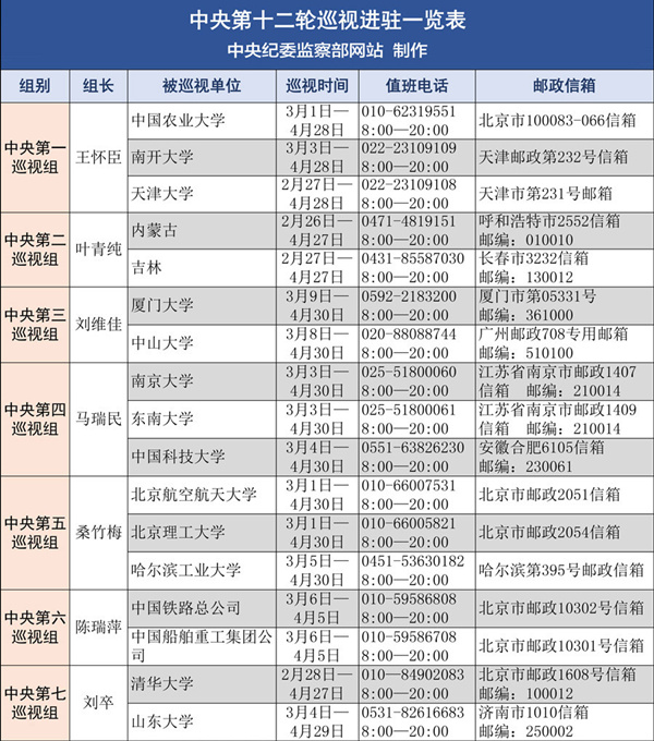 ????經中央批準,十八屆中央第十二輪巡視對北京大學、清華大學、北京師范大學、中國農業大學、北京航空航天大學、北京理工大學、南開大學、天津大學、大連理工大學、吉林大學、哈爾濱工業大學、上海交通大學、同濟大學、南京大學、東南大學、浙江大學、中國科學技術大學、廈門大學、山東大學、武漢大學、華中科技大學、中南大學、中山大學、重慶大學、四川大學、西安交通大學、西北農林科技大學、西北工業大學、蘭州大學等29所中管高校黨委開展專項巡視。同時,對內蒙古、吉林、云南、陜西等4個省區開展“回頭看”,對中央網絡安全和信息化領導小組辦公室、國務院扶貧開發領導小組辦公室、中國鐵路總公司、中國船舶重工集團公司等4個單位試點開展“機動式”巡視。近期,中央巡視組已全部進駐上述地區和單位并召開動員會。現發布中央巡視組進駐情況,敬請關注。