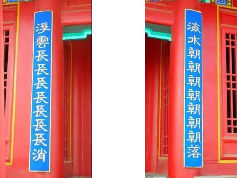在孟姜女廟廟門上的這副千古奇聯,每聯十字,七字同形,初次吟誦可能無從下手,仔細揣摩便會有所領悟。這是利用漢字同形異音、異義的特點,不同的讀音和斷句,就能組合搭配成不同的讀法和寓意。