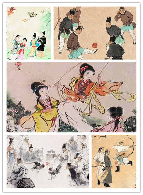 ????清明節(jié)還有大量游樂的風習,如延續(xù)至今的拔河、放風箏和蕩秋千等,也還有曾盛行一時的射柳、蹴鞠和斗雞。