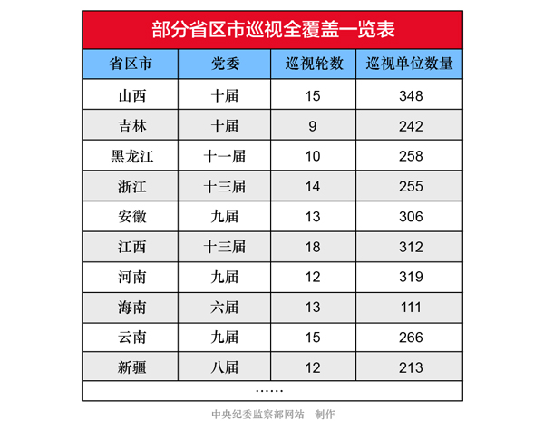 ????在完成巡視全覆蓋任務的同時,各地也紛紛曬出了自己的巡視成績單。山西省委15輪巡視共巡視348個黨組織,發現問題線索9804條,反饋問題6157個;湖北省委巡視機構在巡視300個地方和單位黨組織時發現面上問題7840個、領導干部問題線索12567個,各級紀檢監察機關根據巡視移交的問題線索立案查處黨員干部4362人;吉林省委共開展9輪巡視,對242個黨組織進行政治體檢,共發現問題線索5085件,涉及省管干部408人(次),處級干部1157人(次);江西省委開展18輪巡視,完成對312個黨組織巡視,巡視組共與22449名干部進行個別談話,發現問題線索5107件,其中涉及廳級干部621人,縣處級干部1887人……