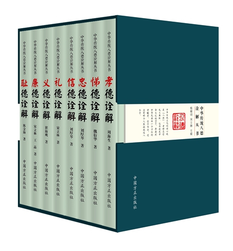 ????《中華傳統八德詮解叢書》由中國方正出版社出版,是一部以闡釋中華傳統八德——孝悌忠信禮儀廉恥為主要內容的通俗理論讀物,由著名學者、中國孔子研究院院長楊朝明擔綱主編。該書共70余萬字,分為《孝德詮解》《悌德詮解》《忠德詮解》《信德詮解》《禮德詮解》《義德詮解》《廉德詮解》《恥德詮解》8冊,分別闡釋每一德目的起源、涵義和本質。