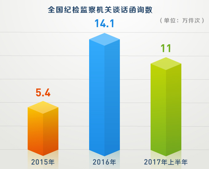 ????數據是最好的證明。2015年,全國紀檢監察機關共談話函詢5.4萬件(次);2016年,這個數字上升到14.1萬件次;而2017年僅上半年,全國紀檢監察機關就談話函詢11萬件次,比去年同期增長162%。