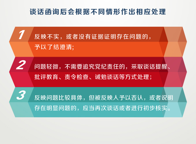 ????組織找干部談話函詢,不是故意找茬或小題大做,而是針對苗頭性、傾向性、一般性的問題進行處置。如果反映不實,組織會予以澄清;如果干部如實說明情況且反映問題輕微,不需要追究黨紀責任的,組織會采取談話提醒、批評教育、責令檢查、誡勉談話等方式處理,及時了結,讓同志放下包袱。可見,談話函詢既是了解情況,也是組織給予干部坦白澄清的機會 。