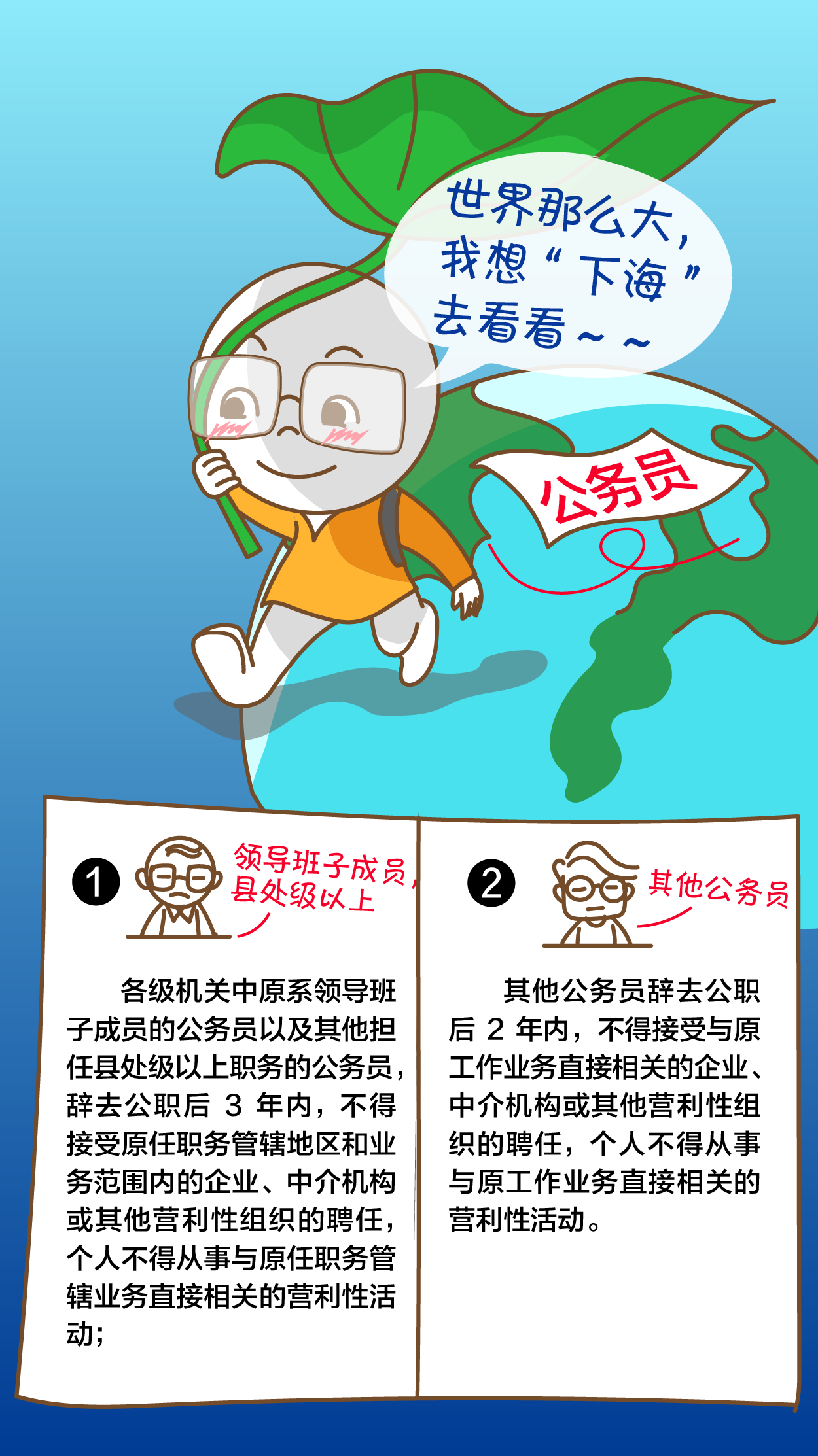 ????二、各級機關中原系領導班子成員的公務員以及其他擔任縣處級以上職務的公務員,辭去公職后3年內,不得接受原任職務管轄地區和業務范圍內的企業、中介機構或其他營利性組織的聘任,個人不得從事與原任職務管轄業務直接相關的營利性活動;其他公務員辭去公職后2年內,不得接受與原工作業務直接相關的企業、中介機構或其他營利性組織的聘任,個人不得從事與原工作業務直接相關的營利性活動。