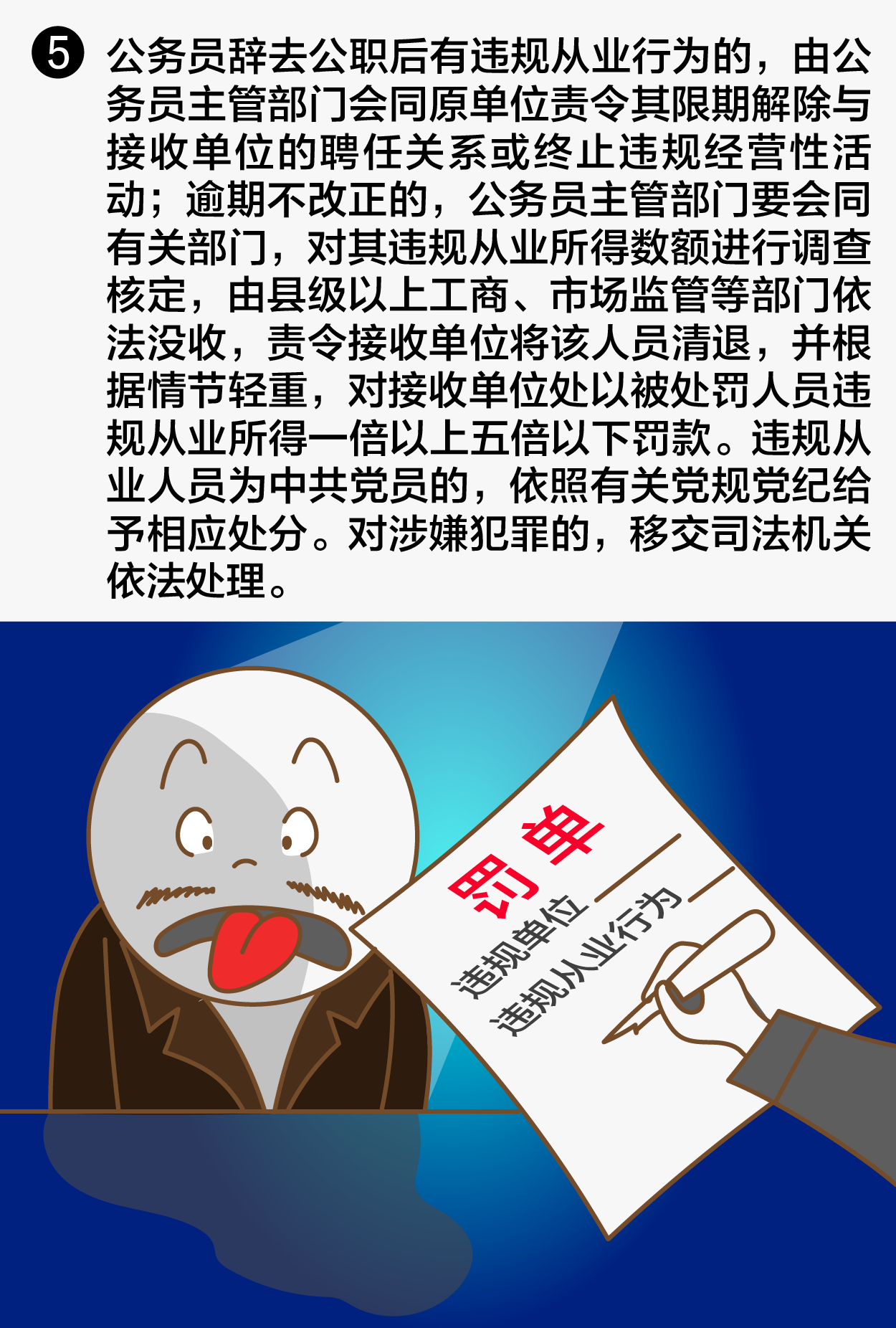 ????六、公務員辭去公職后有違規從業行為的,由公務員主管部門會同原單位責令其限期解除與接收單位的聘任關系或終止違規經營性活動;逾期不改正的,公務員主管部門要會同有關部門,對其違規從業所得數額進行調查核定,由縣級以上工商、市場監管等部門依法沒收,責令接收單位將該人員清退,并根據情節輕重,對接收單位處以被處罰人員違規從業所得一倍以上五倍以下罰款。違規從業人員為中共黨員的,依照有關黨規黨紀給予相應處分。對涉嫌犯罪的,移交司法機關依法處理。