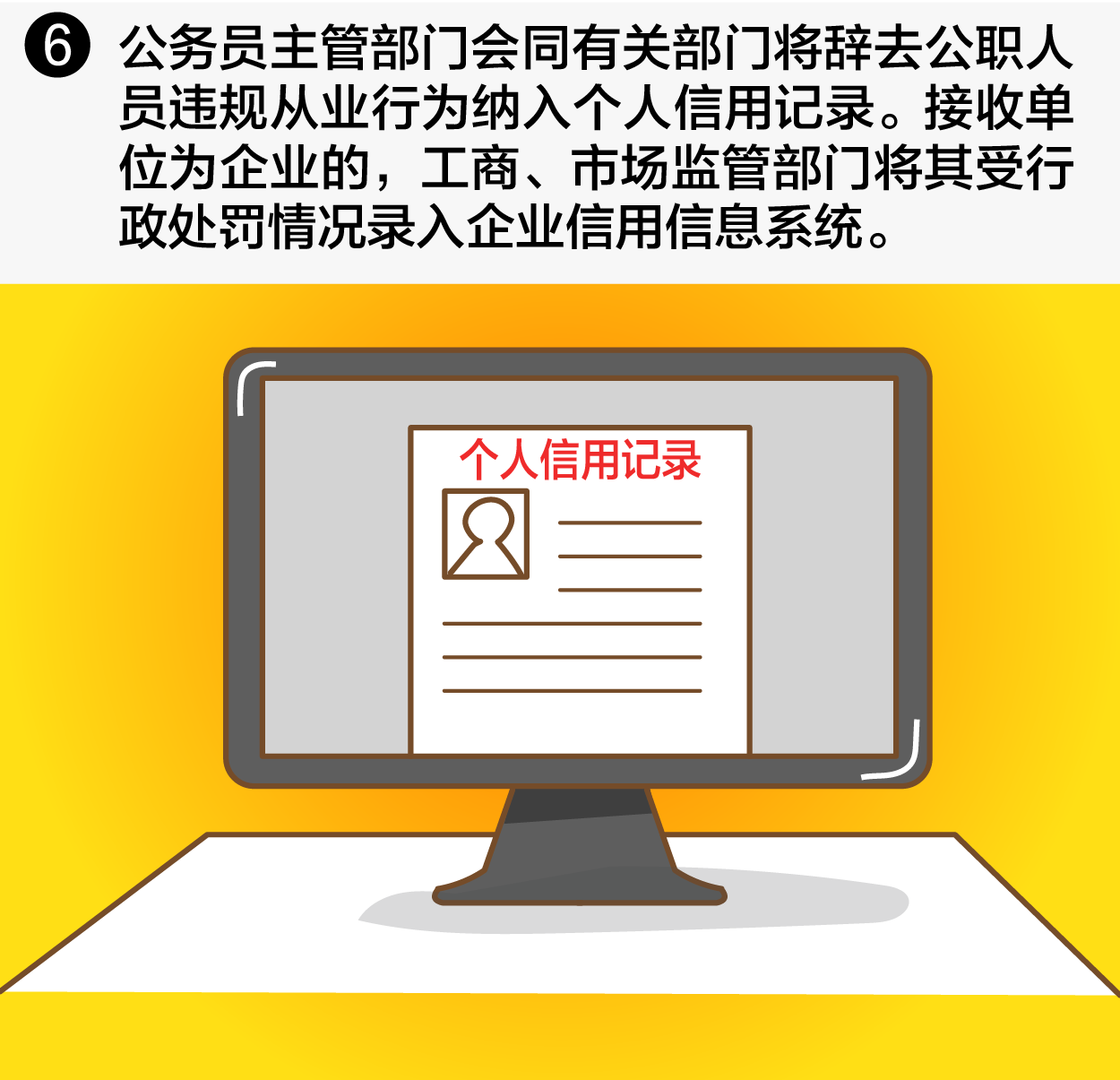 ????公務員主管部門會同有關部門將辭去公職人員違規從業行為納入個人信用記錄。接收單位為企業的,工商、市場監管部門將其受行政處罰情況錄入企業信用信息系統。