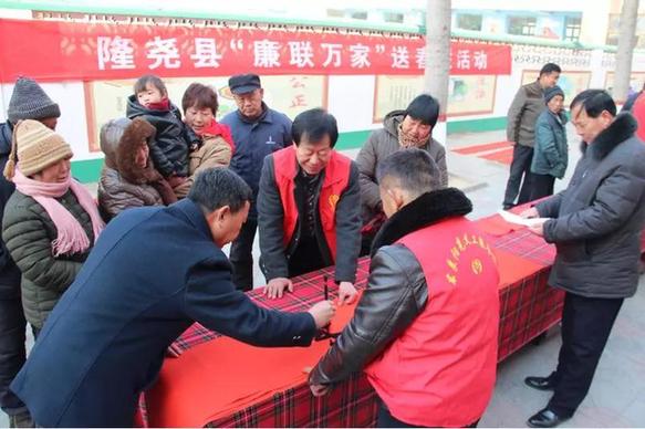 ????近日,隆堯縣紀委在東良鄉(xiāng)澤畔村舉辦 “廉聯(lián)萬家”送春聯(lián)活動。來自市縣書法家協(xié)會的10位書法家現(xiàn)場揮毫潑墨,認真書寫頗具“廉味”的新春對聯(lián)100余幅,受到廣大干部群眾的好評。