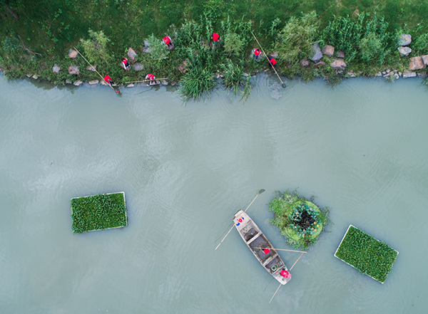 ????在浙江省長興縣劉家渡河道南太湖段,河長帶領專職保潔人員進行日常的鄉(xiāng)村河道護理(2017年10月13日攝)。(新華社記者 徐昱 攝)