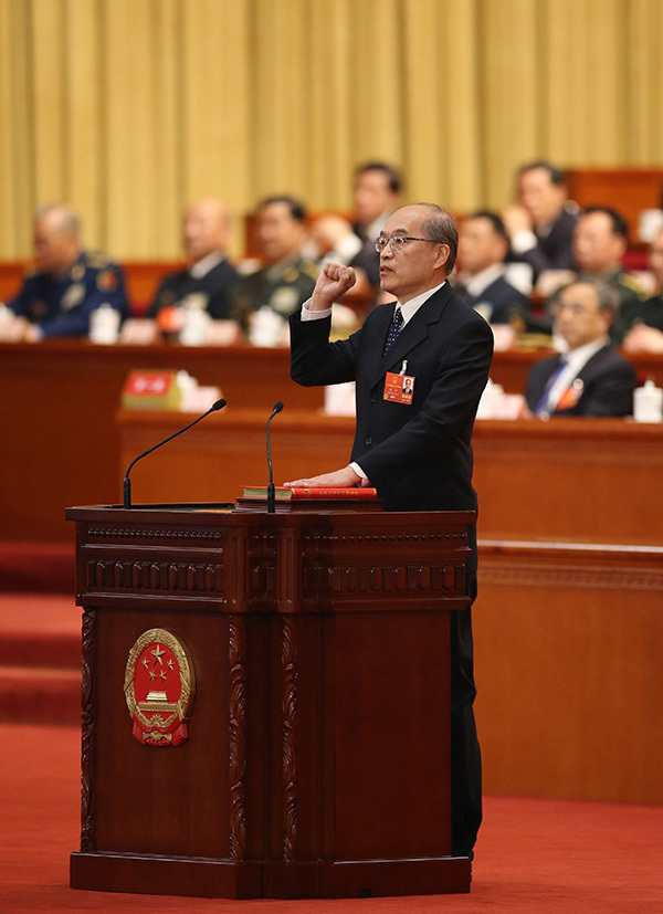 ????3月18日,十三屆全國人大一次會議在北京人民大會堂舉行第六次全體會議。周強當選為中華人民共和國最高人民法院院長。這是周強進行憲法宣誓。(新華社記者 姚大偉 攝)