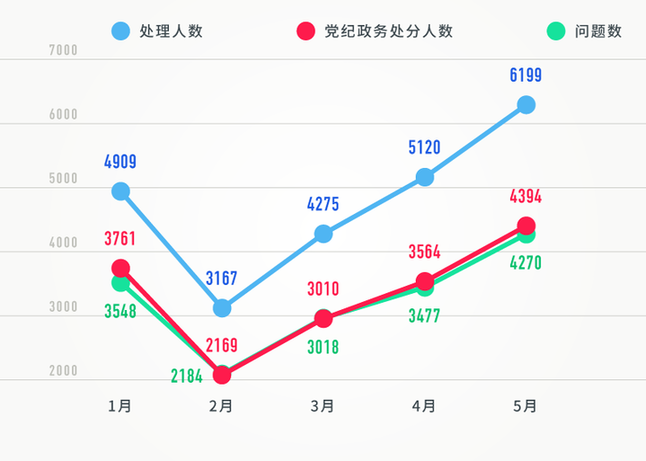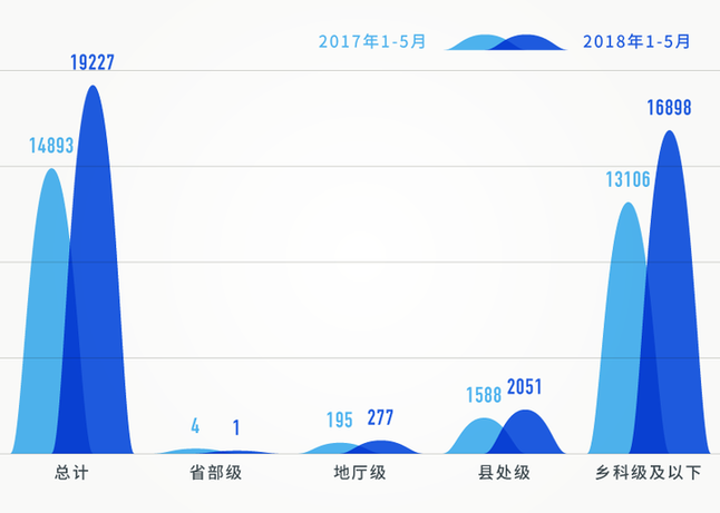 ????在給予黨政紀處分人數中,除省部級干部人數降低了以外,地廳級、縣處級、鄉科級及以下人數相比同期均大幅提升。特別是,今年1-5月,給予鄉科級及以下人員黨紀政務處分達16898人,相比同期增長28.9%,且占到了處分總人數的87.9%。反映出全面從嚴治黨不斷向基層延伸,持續加大查處群眾身邊的“四風”和腐敗問題力度。