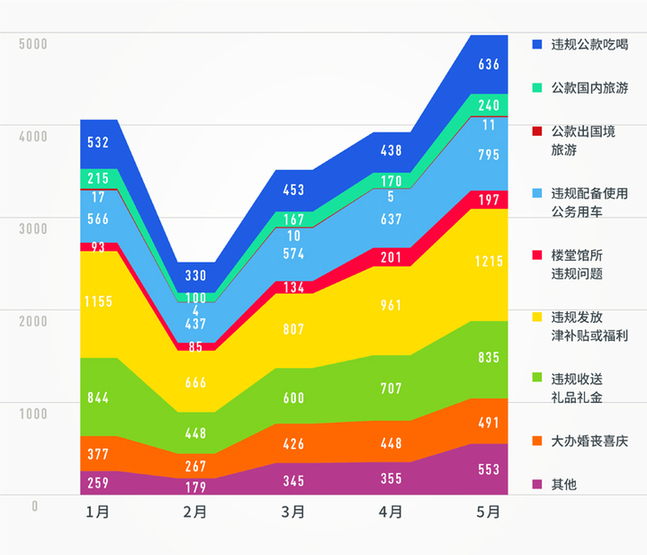 ????再來看,違反中央八項規定精神問題類型。從1至5月各類查處問題的面積分布圖來看,各類具體問題的查處趨勢也保持了較穩定的增長態勢。值得注意的是,違規發放津補貼或福利、違規收送禮品禮金、違規配備使用公務用車、違規公款吃喝、大辦婚喪喜慶等問題類型,相比同期仍是所有問題類型的“大頭”(占據前5名),占比仍超80%。數據顯示,這些老問題,仍需下大氣力糾治,持之以恒,久久為功。