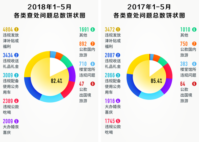 ????2017年、2018年1-5月各類查處問題總數餅狀圖,違規發放津補貼或福利、違規收送禮品禮金、違規配備使用公務用車、違規公款吃喝、大辦婚喪喜慶等“老問題”占比較大,均超80%
