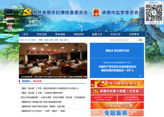 ????在建黨97周年到來之際,承德市紀委監委網站(http://www.cdjjjc.gov.cn)于7月1日全新改版上線。同時,微信公眾號“廉潔承德”同步上線,形成了“一網一微”網絡宣傳格局,為深入推進黨風廉政建設和反腐敗工作營造良好輿論環境。