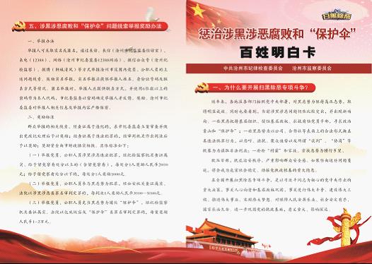 ????為充分調動社會各界和人民群眾廣泛參與懲治涉黑涉惡腐敗和“保護傘”工作的積極性,近日,滄州市紀委監委印制了15萬份《懲治涉黑涉惡腐敗和“保護傘”百姓明白卡》,發放到轄區內黨政機關、企事業單位、人民團體和居民社區、城鎮鄉村的黨員干部和人民群眾手中。