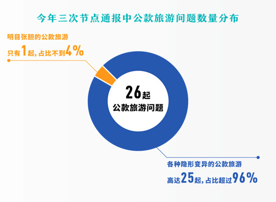 ????進(jìn)一步分析中央紀(jì)委國家監(jiān)委網(wǎng)站今年元旦春節(jié)、五一端午、中秋國慶3個(gè)重要時(shí)間節(jié)點(diǎn)“違反中央八項(xiàng)規(guī)定精神問題監(jiān)督舉報(bào)曝光專區(qū)”通報(bào)曝光的13期179起典型案例,26起公款旅游問題中,明目張膽的公款旅游只有1起,而各種隱形變異的公款旅游高達(dá)25起。這一現(xiàn)象,值得我們高度重視和警惕。