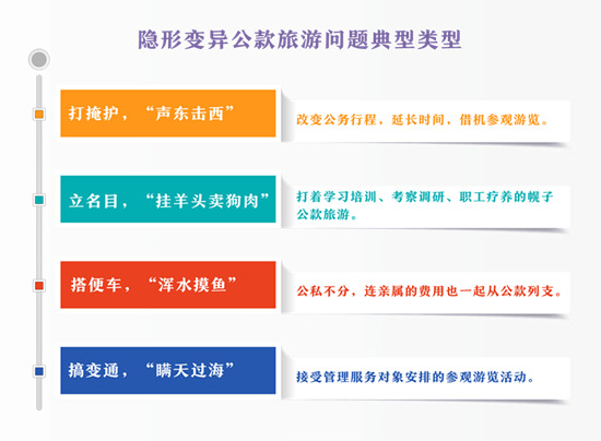 ????透過這些案例,不難發(fā)現(xiàn),當(dāng)前明目張膽的公款旅游少了,而穿上“馬甲”、隱形變異的公款旅游多了。有的打掩護(hù),“聲東擊西”,改變公務(wù)行程,延長時(shí)間,借機(jī)參觀游覽;有的立名目,“掛羊頭賣狗肉”,打著學(xué)習(xí)培訓(xùn)、考察調(diào)研、職工療養(yǎng)的幌子公款旅游;有的搭便車,“渾水摸魚”,公私不分,連親屬的費(fèi)用也一起從公款列支;還有的搞變通,“瞞天過海”,接受管理服務(wù)對(duì)象安排的參觀游覽活動(dòng)。