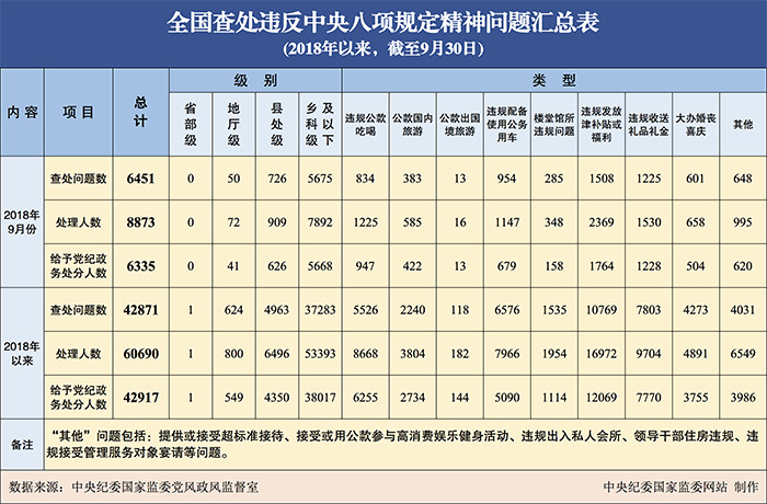 ????為掌握全國(guó)貫徹落實(shí)中央八項(xiàng)規(guī)定精神情況,中央紀(jì)委在各省區(qū)市和新疆生產(chǎn)建設(shè)兵團(tuán)、各中央和國(guó)家機(jī)關(guān)、各中央企業(yè)和中央金融企業(yè)等建立了落實(shí)中央八項(xiàng)規(guī)定精神情況月報(bào)制度。2018年以來,截至9月30日,全國(guó)查處違反中央八項(xiàng)規(guī)定精神問題情況如下:
