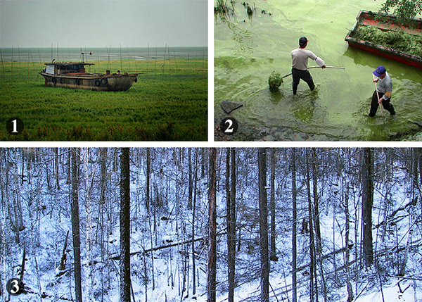 ????1:2011年,江西省新建縣南磯鄉(xiāng),一艘大漁船擱淺在鄱陽湖湖底草坪上。2:2001年,工作人員在江蘇無錫黿頭渚景區(qū)“圍剿”太湖藍(lán)藻。3:2002年,采伐后大興安嶺稀疏的森林。