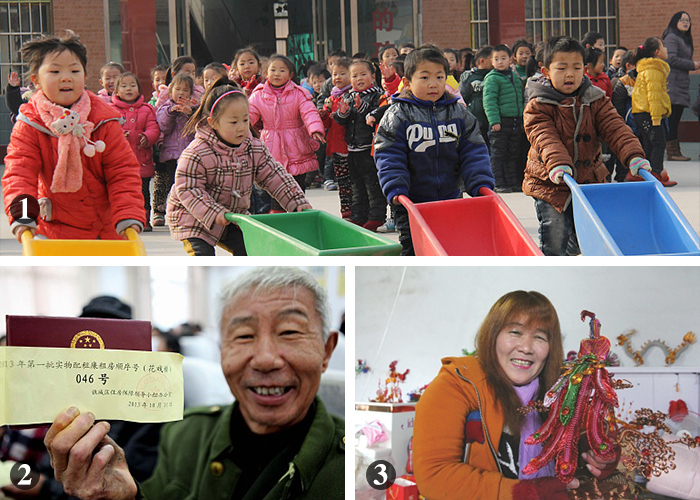 ????1. 2012年11月29日,河南省一家幼兒園的孩子們在做游戲;2. 2013年10月31日,安徽省亳州市譙城區薛閣辦事處,一位市民展示抽到的廉租房順序號;3. 河南省永城市馬牧鎮殘疾人馬向前創辦的手工藝品加工廠工人在展示氧化鋁手工藝品