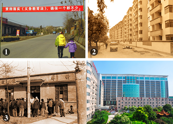 ????1. 2006年6月26日,湖北省宜昌市農村某小學在馬路上空掛起“貫徹落實《義務教育法》,確保一個都不少”的公益宣傳;2. 1982年竣工的全國第一個商品住宅項目廣東省廣州市東湖新村;3. 圖左為1979年冬,河南省鄲城縣人民醫院創建的我國縣級醫院第一個顯微外科。圖右為2017年,鄲城縣人民醫院成為2015-2017年改善醫療服務優質服務示范醫院