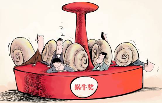 ????相比奔牛、駿馬,蝸牛的形象總是與遲緩拖沓相聯系。“蝸牛獎”與電影行業的“金掃帚獎”類似,雖然以“獎”為名,其用意卻顯然不是褒獎,而是嘲諷、喝倒彩,是獨具匠心的“罰”。2018年,多個地方設立“蝸牛獎”,向不作為、慢作為、不擔當問題亮劍。例如,山東省淄博市周村區出臺《關于大力弘揚“店小二”精神 打造最優營商環境的實施意見》,在山東省首設“蝸牛獎”,山東省日照開發區緊隨其后設立“蝸牛獎”。安徽岳西、浙江縉云、貴州貴定等地也紛紛開設“蝸牛獎”。目前已有多家單位被“授獎”并問責。受此啟發,一些地方還探索為干事創業者頒發“駿馬獎”、為服務態度差者頒發“刺猬獎”、為不擔當者頒發“鴕鳥獎”。