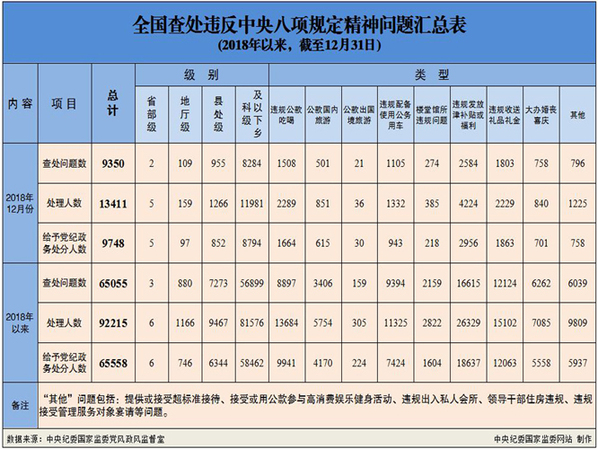 ????為掌握全國(guó)貫徹落實(shí)中央八項(xiàng)規(guī)定精神情況,中央紀(jì)委在各省區(qū)市和新疆生產(chǎn)建設(shè)兵團(tuán)、各中央和國(guó)家機(jī)關(guān)、各中央企業(yè)和中央金融企業(yè)等建立了落實(shí)中央八項(xiàng)規(guī)定精神情況月報(bào)制度。2018年以來(lái),截至12月31日,全國(guó)查處違反中央八項(xiàng)規(guī)定精神問(wèn)題情況如下: