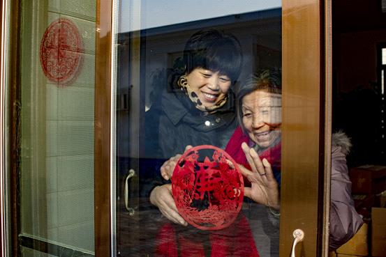 ????昌黎縣76歲的民間剪紙藝人田秀云(右)將親手剪的“廉潔”窗花貼到了村干部家中。