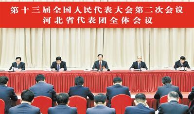 ????3月3日下午,在京出席十三屆全國人大二次會議的河北省代表團召開全體會議。全國人大代表、省委書記、省人大常委會主任王東峰主持會議。
