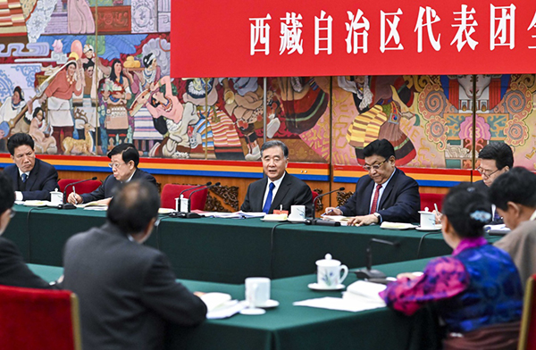 ????汪洋在西藏代表團參加審議。在聽取普布頓珠、格桑卓嘎、扎西江村等代表發言后,汪洋表示,完全贊成栗戰書委員長所作的全國人大常委會工作報告。汪洋充分肯定過去一年西藏各項事業發展成績,指出西藏經濟發展和社會穩定持續向好,但也要看到風險挑戰。要深入學習貫徹習近平總書記關于西藏工作的重要論述,牢牢把握維護祖國統一、加強民族團結的著眼點和著力點,牢牢把握依法治藏、富民興藏、長期建藏、凝聚人心、夯實基礎的重要原則,居安思危、穩中求進,進一步鞏固社會大局穩定好局面,進一步加強寺廟管理能力建設,進一步提高脫貧攻堅質量,確保雪域高原安定祥和、各族人民安居樂業。